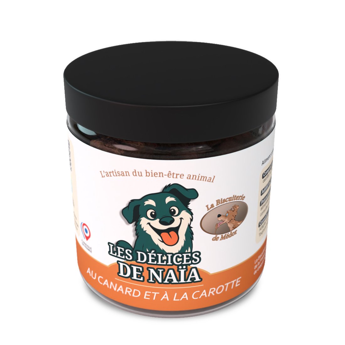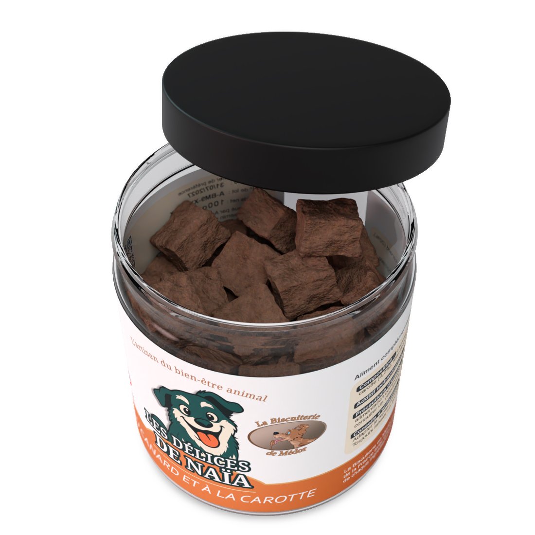 Offrez à votre chien une friandise simple, saine et savoureuse avec Les Délices de Naïa au canard et à la carotte, une recette sans céréales, élaborée en France avec des ingrédients soigneusement sélectionnés.