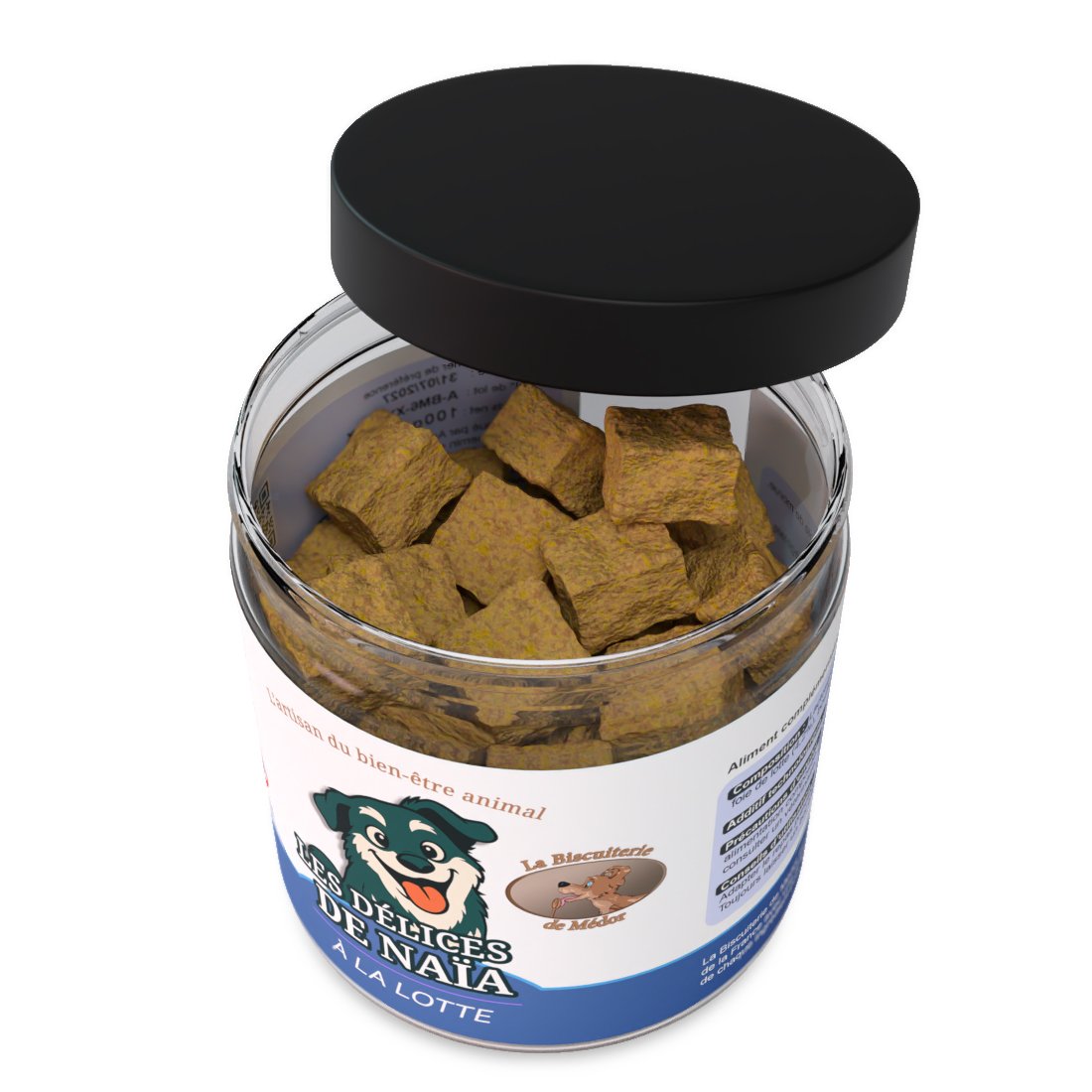 Offrez à votre chien une récompense saine et gourmande avec Les Délices de Naïa à la lotte, des friandises sans céréales, élaborées en France à partir de foie de lotte soigneusement sélectionné.