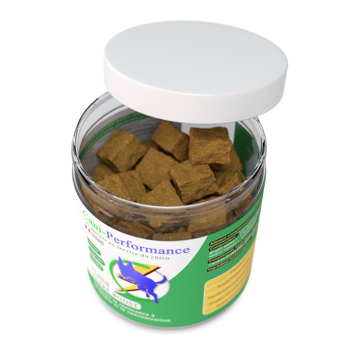 Le Flash Ultra Boost est un complément alimentaire sous forme de biscuit appétent, spécialement conçu pour offrir un coup de fouet immédiat aux chiens sportifs, de travail ou de compétition. Il soutient le dynamisme, la réactivité et la motivation pendant l’effort ou avant une épreuve intense. Sa formule associe des ingrédients naturels sélectionnés pour leur efficacité et leur action rapide :